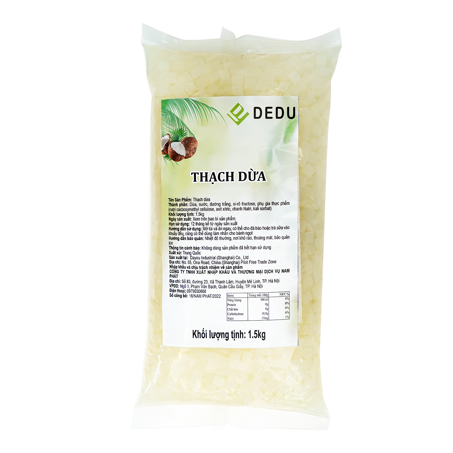 Thạch Dừa DEDU: Thạch có màu trắng và vị ngọt béo của dừa, tạo cảm giác ngon miệng và bổ dưỡng. Thạch dừa phù hợp với các loại đồ uống như trà sữa thạch dừa, sinh tố thạch dừa, sữa chua thạch dừa,…