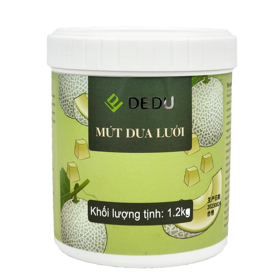 Mứt Sốt Dưa Lưới DEDU: Mứt có màu đỏ và vị ngọt mát của dưa lưới, tạo cảm giác tươi mới và thú vị. Mứt sốt dưa lưới phù hợp với các loại đồ uống như trà dưa lưới, soda dưa lưới, sữa chua dưa lưới,…