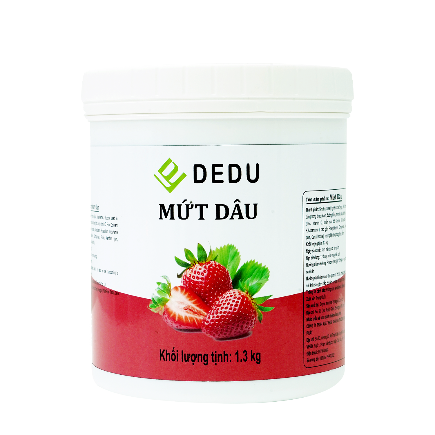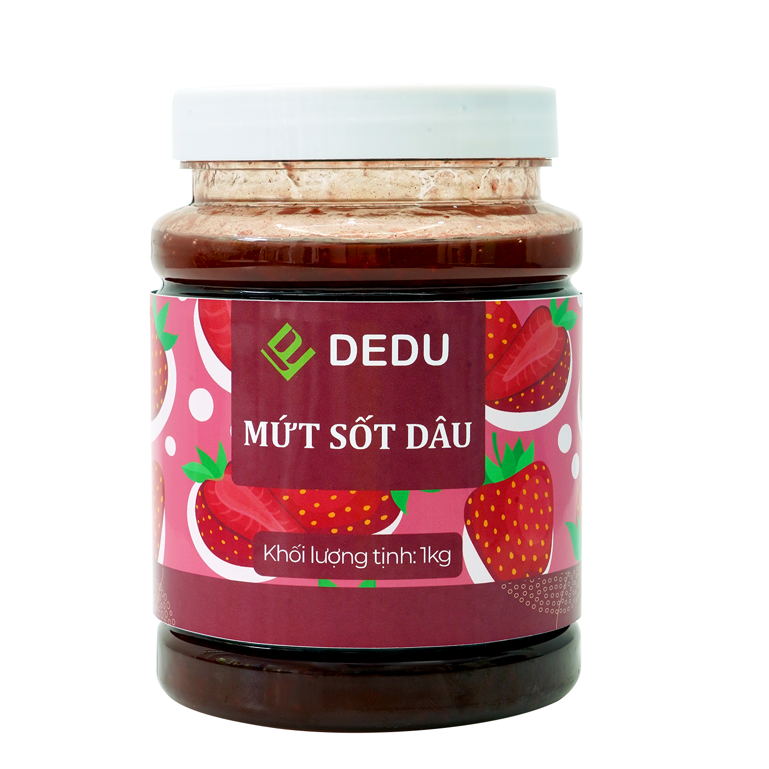 Mứt Sốt Dâu DEDU: Mứt có màu hồng và vị ngọt dịu của dâu tây, mang lại cảm giác ngọt ngào và dễ chịu. Mứt sốt dâu thích hợp với các loại đồ uống như trà dâu, sữa dâu, kem cheese dâu,…