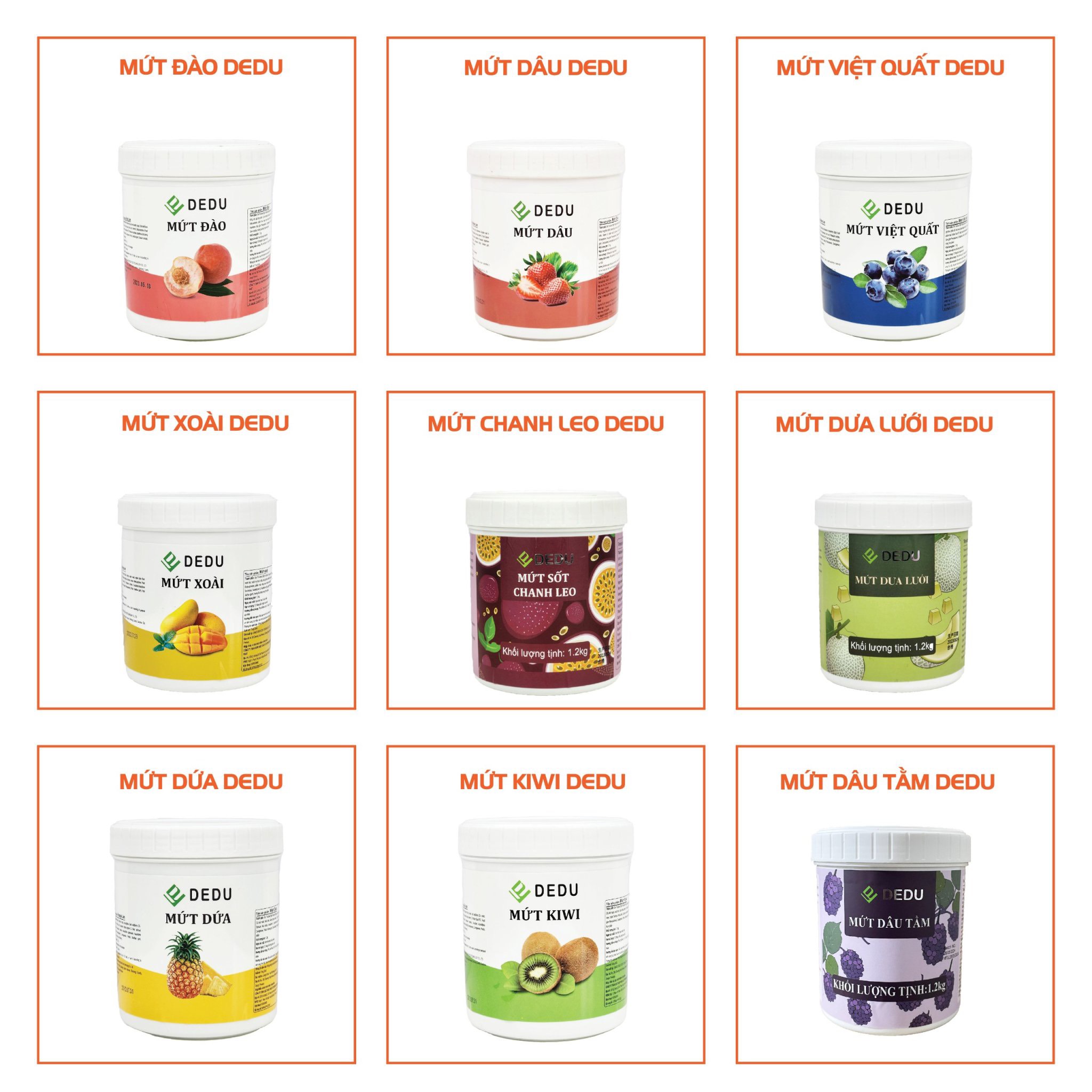 Mứt Trái Cây: Mứt trái cây của DEDU Việt Nam được làm từ những loại trái cây tươi ngon nhất, giữ trọn vẹn hương vị tự nhiên và giàu dinh dưỡng. Đây là nguyên liệu không thể thiếu trong các món trà sữa, trà trái cây, hay thậm chí là topping cho các món bánh ngọt.