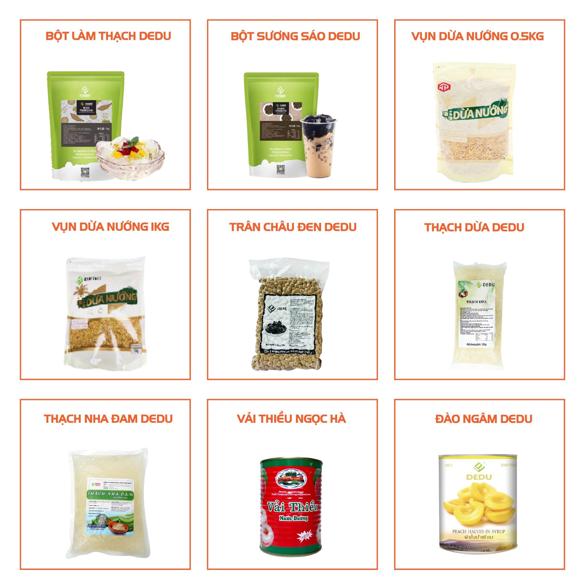 Topping Độc Đáo: DEDU cung cấp nhiều loại topping độc đáo như trân châu, thạch, củ năng, và đậu đỏ, giúp tăng thêm sự phong phú và thú vị cho các món đồ uống. Các sản phẩm topping của chúng tôi luôn đảm bảo chất lượng tốt nhất, an toàn và dễ dàng sử dụng.